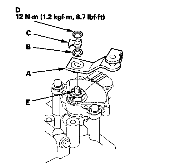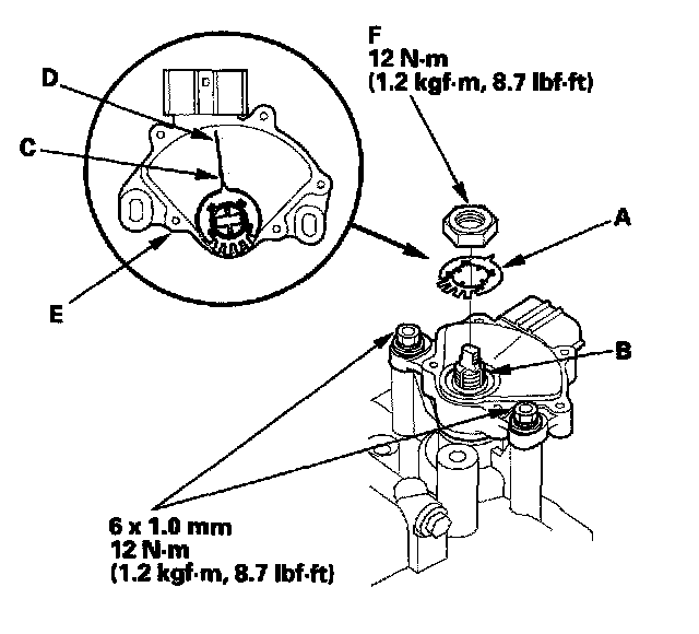 63. Install the new lock washer (A) over the selector control shaft (B) with aligning the projection (C) of the lock washer with the N positioning line (D) on the transmission range switch (E), and install the locknut (F).