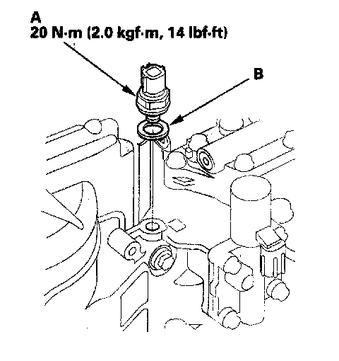 69. Install the 4th clutch transmission fluid pressure switch (A) with the new sealing washer (B). Tighten the switch with the metal part.