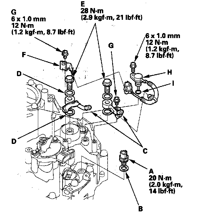 72. Install the connector bracket (F), and secure the ATF lines with the 6.6 mm bolts (G) on the transmission housing. Tighten the bolts to 12 Nm (1.2 kgf-m, 8.7 ft. lbs.).