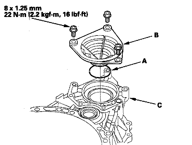 76. 2WD model: Install the new O-ring (A) on the torque converter housing cap (B), and install the cap in the torque converter housing (C).