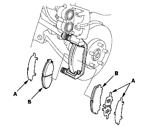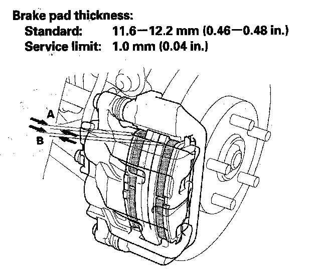 3. Check the thickness of the inner pad (A) and outer pad (B). Do not include the thickness of the backing plate.