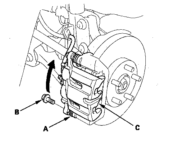 3. While holding the caliper pin (A) with a wrench, remove the flange bolt (B). Be careful not to damage the pin boot. Then pivot the caliper (C) up out of the way. Check the hose and pin boots for damage and deterioration.
