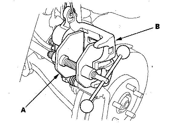 11. Mount the brake caliper piston compressor (A) on the caliper (B).