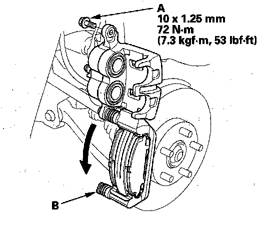 14. Pivot the caliper down into position. Install the flange bolt (A), and tighten it to the specified torque while holding the caliper pin (B), with a wrench, being careful not to damage the pin boot.