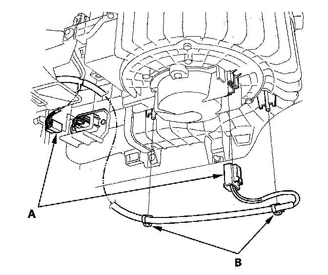 4. Disconnect the connectors (A) from the blower motor and the power transistor, then remove the wire harness clips (B).