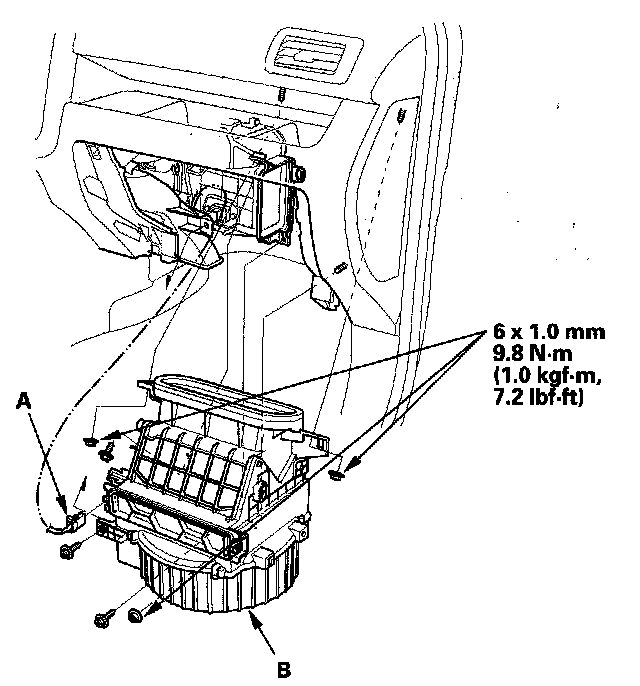 5. Disconnect the connector (A) from the recirculation control motor, then remove the bolts, the mounting nuts and the blower unit (B).