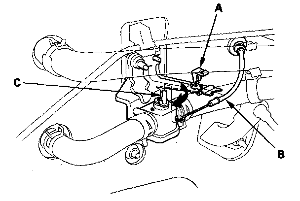 4. From under the hood, open the cable clamp (A), then disconnect the heater valve cable (B) from the heater valve arm (C). Turn the heater valve arm to the fully opened position as shown.