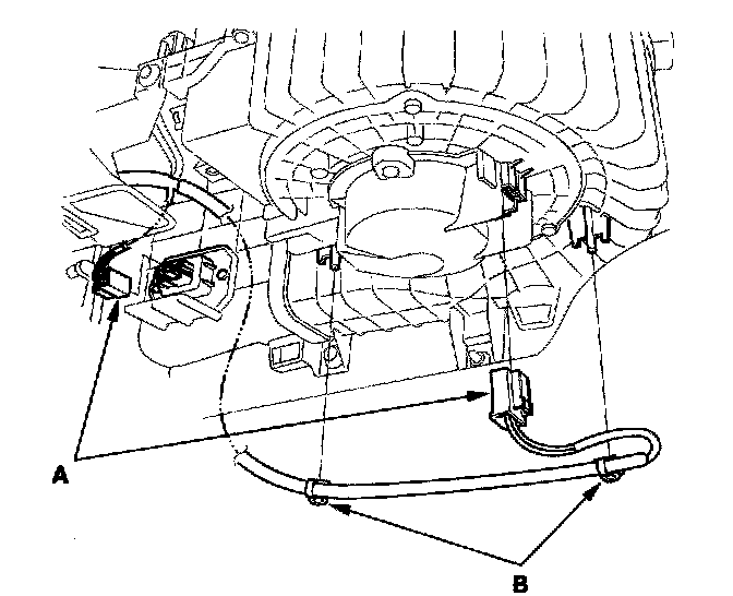 9. Disconnect the connectors (A) from the blower motor and the power transistor, then remove the wire harness clips (B).