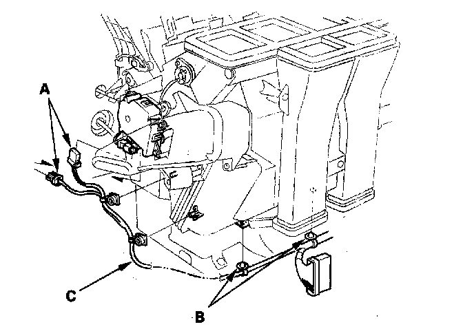 11. Disconnect the connectors (A) from the evaporator sensor and the air mix control motor, then remove the wire harness clips (B) and the wire harness (C).