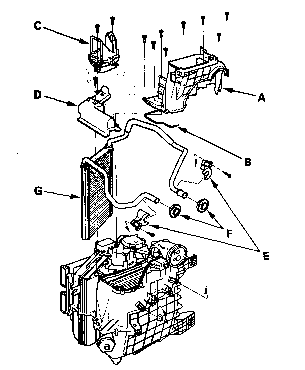 13. Remove the self-tapping screws, the joint duct (A), and seal (B). Remove the self-tapping screws, then remove the passenger's heater outlet (C), and the heater core cover (D). Remove the self-tapping screws, the heater pipe brackets (E), the grommets (F), and carefully pull out the heater core (G) so you don't bend the inlet and outlet pipes.
