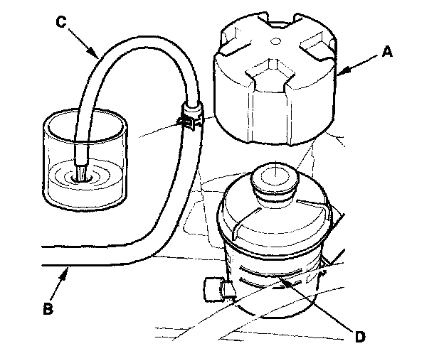 2. Connect a hose (C) of suitable diameter to the disconnected return hose, and put the hose end in a suitable container.