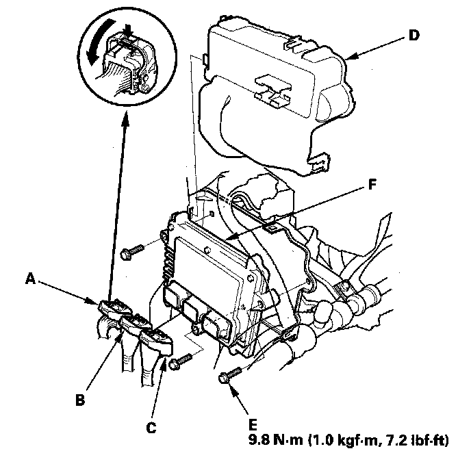 NOTE: PCM connectors A, B, and C have symbols (A=[], B=/\, C=O) embossed on them for identification.