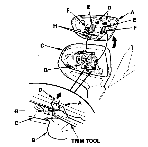 2. Put a shop towel (B) in the opening between the lower edge of the mirror holder and the mirror housing (C) to prevent scratches, and detach the bottom clips (D) with a trim tool.