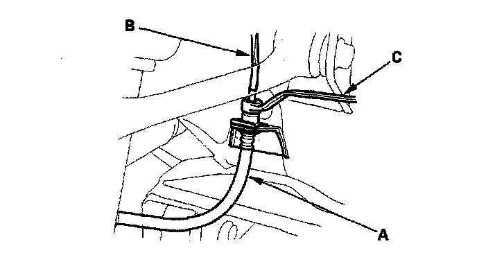 7. Install the brake hose (A) on the upper brake hose bracket (B) with a new brake hose clip (C).