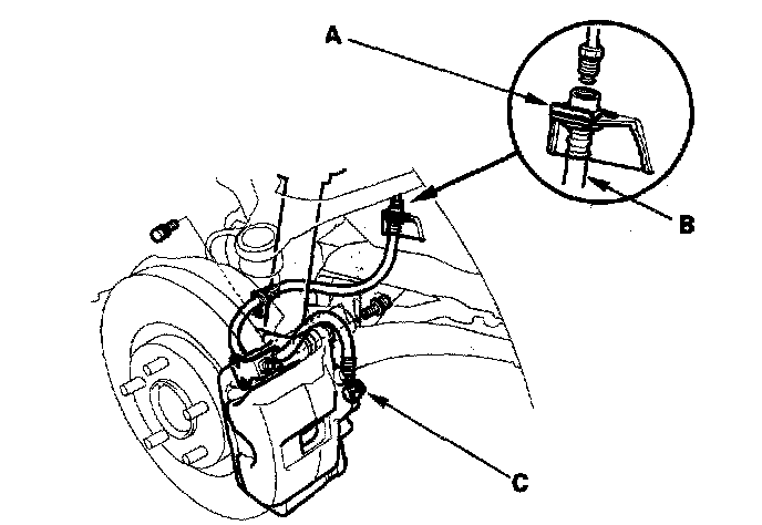 4. Remove the banjo bolt (C), and disconnect the brake hose from the caliper.