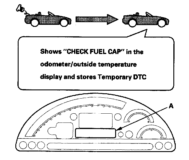 During the first drive cycle after a cold start, the ECM alerts the driver to check the fuel fill cap by showing a "CHECK FUEL CAP" message in the odometer/outside temperature display (A), and it stores Temporary DTC P0457 "Evaporative Emission (EVAP) System Leak Detected/Fuel Fill Cap Loose or Missing". Tightening the fuel cap does not make the message go off immediately.