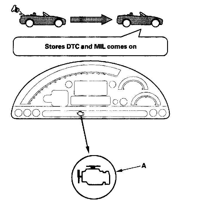 During the third drive cycle after a cold start, if the fuel fill cap is still loose or missing, the ECM stores DTC P0457 "Evaporative Emission (EVAP) System Leak Detected/Fuel Fill Cap Loose or Missing". The malfunction indicator lamp (MIL) (A) comes on, and the "CHECK FUEL CAP" message goes off.