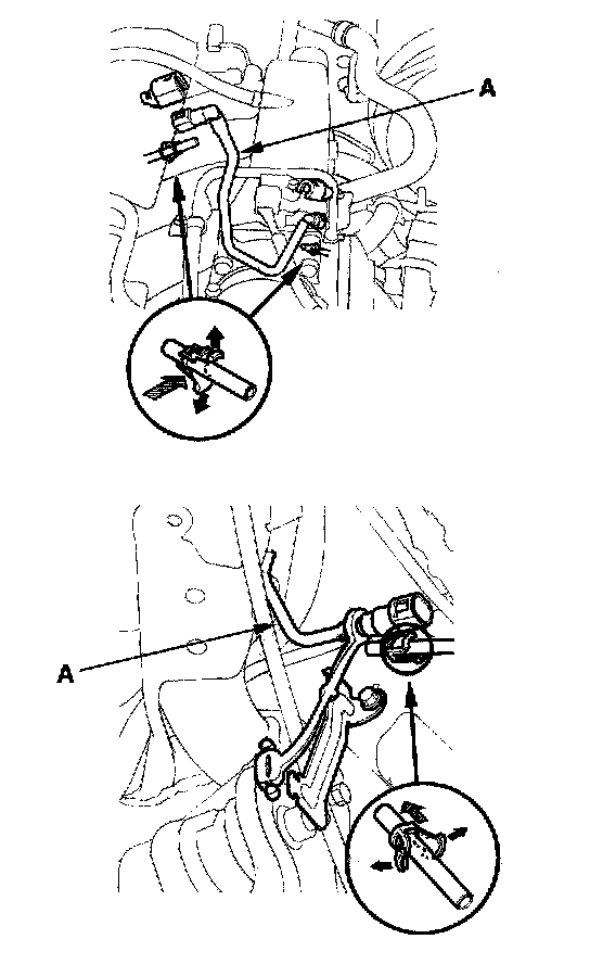 3. Before connecting a new fuel tube/quick-connect fitting assembly (A), remove the old retainer from the mating pipe.