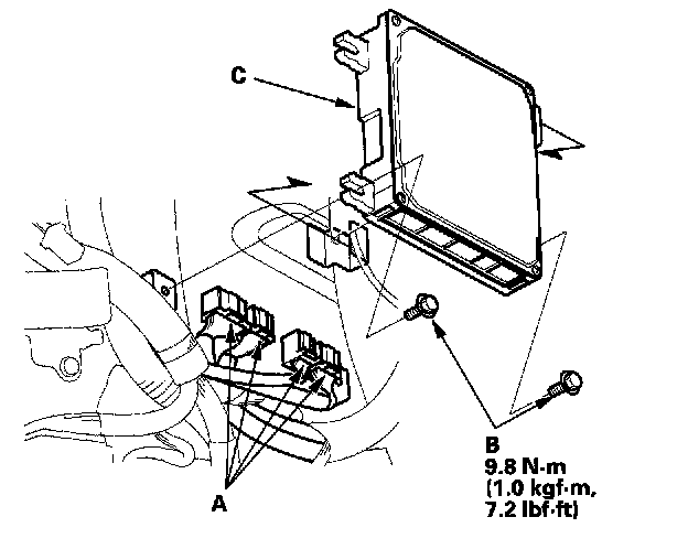 11. Remove the bolts (B), then remove the ECM (C).