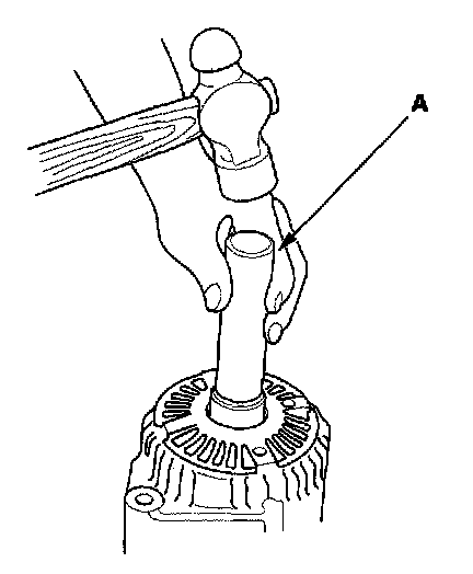 16. Support the stator housing in a vise, and drive out the front bearing with a brass drift (A) and hammer.