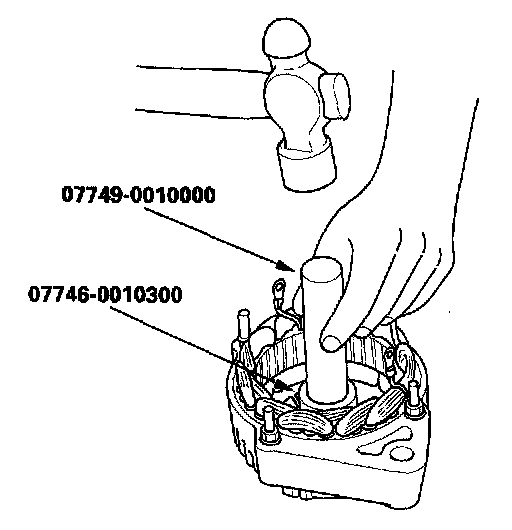 17. With a hammer and the special tools, install a new front bearing in the stator housing.