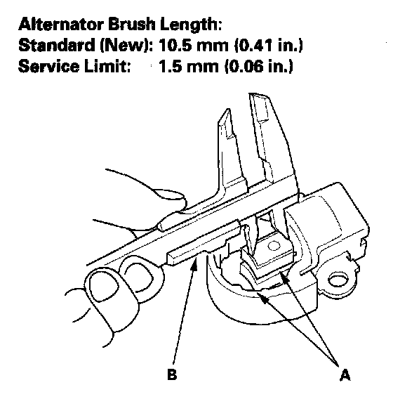 19. Measure the length of both brushes (A) with a vernier calipers (B).