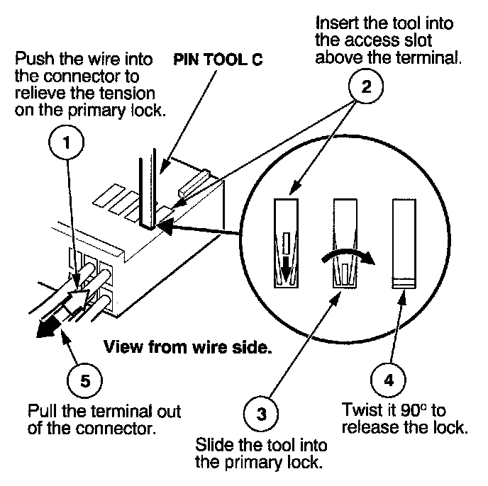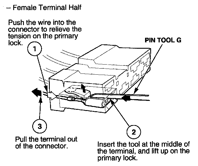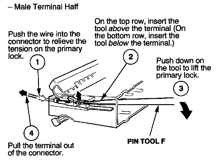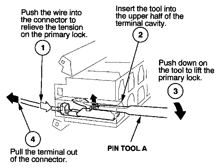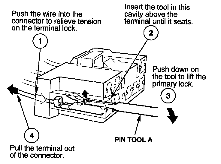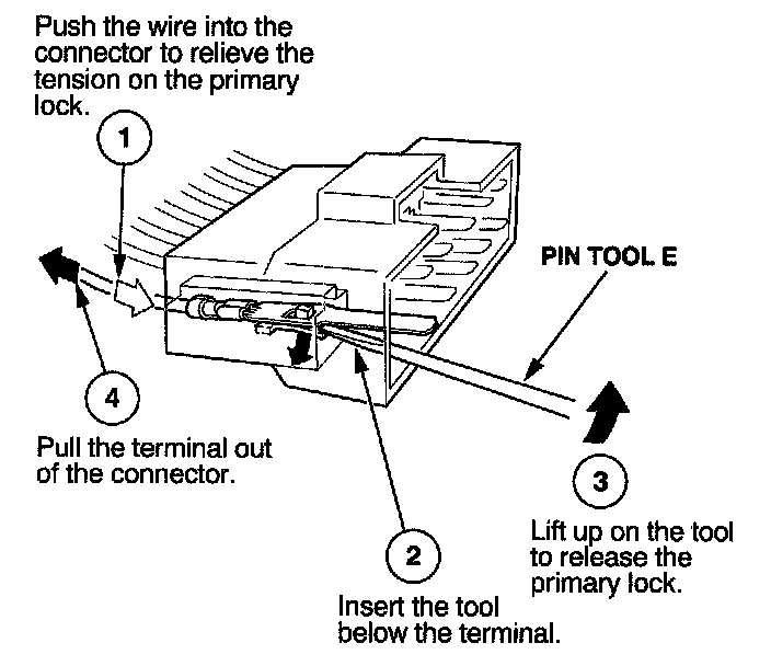 Before you begin, inspect the wire you are about to repair for damage and length. Make sure the wire will be long enough to make a terminal repair without stretching it when you reinstall the terminal in the connector. If the wire is too short, or if access to the connector is too restricted to make a terminal repair, you may need to install a pigtail terminal (a short length of wire with a factory-crimped terminal on it). Refer to HOW TO INSTALL PIGTAIL TERMINALS.