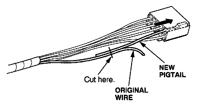 6. Lay the pigtail and the original wire side-by-side, and cut off both ends at once. If you are making more than one splice, do not cut each pigtail at the same location; the resulting "lump" of splice connectors would interfere with rewrapping the harness. Instead, cut the first pigtail close enough to the terminal so you will have room to make each remaining cut about 20 mm (3/4 inch) farther down on the next pigtail.