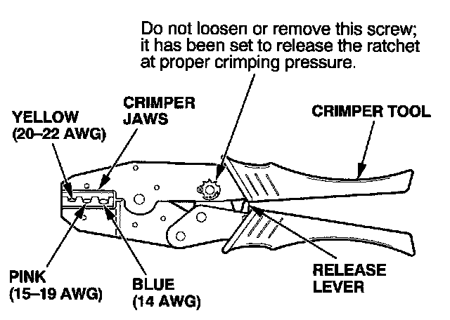 8. Put the splice connector in the proper size slot in the Crimper Tool, slide it to one end (where the flare begins), and close the crimper handles far enough to hold it in place. To release the ratchet mechanism at any point after the first click, squeeze the handles slightly and push the release lever, then let the handles open.