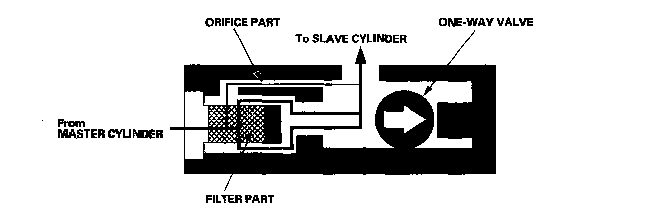 When the clutch pedal is released, the fluid pressure from the slave cylinder moves the one-way valve in the direction shown in the illustration. The one-way valve blocks the filter part passage and delays the clutch release speed by returning the fluid to the master cylinder through only the orifice part passage.