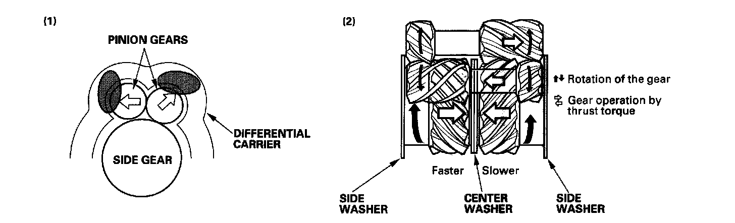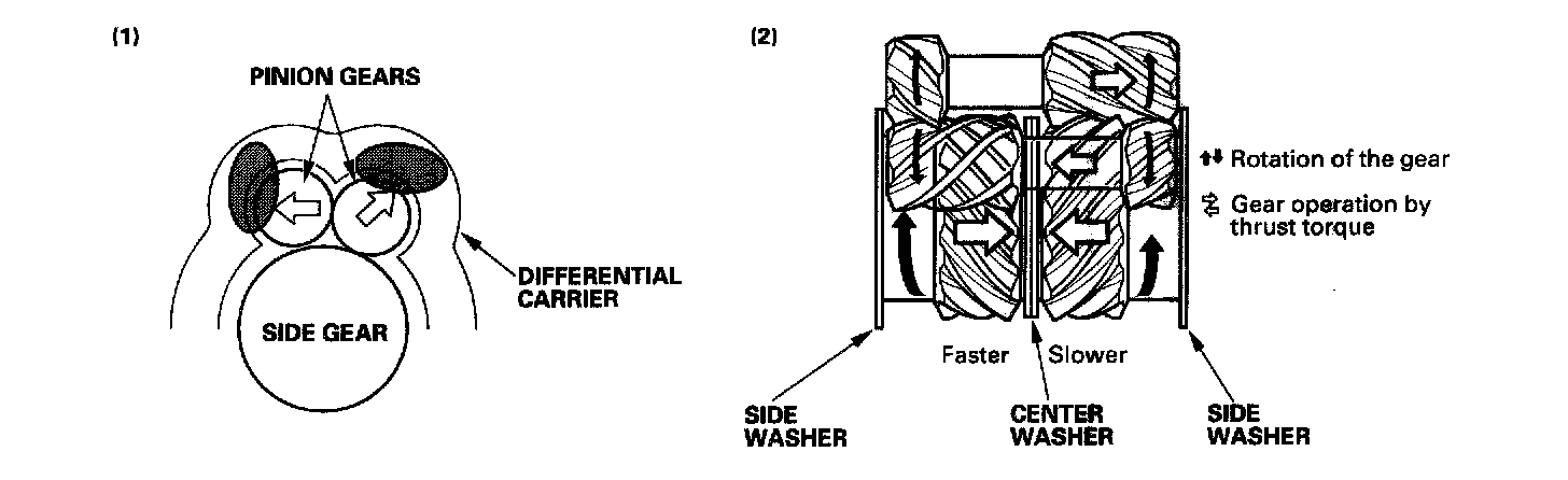 The limited slip differential acts to limit the differential action when either wheel slips on ice or snow or on turns. This is done by using the friction created between each gear and differential carrier: (1) The pinions are forced against the differential carrier by the force as they are rotated and repelled outward. (2) The ends of the pinion gears are held firmly against the differential carrier due to the side thrust from the helically cut gears.