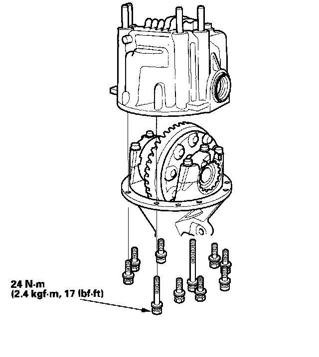 4. Install the differential case assembly, then torque the ten mounting bolts in a crisscross pattern in several steps.