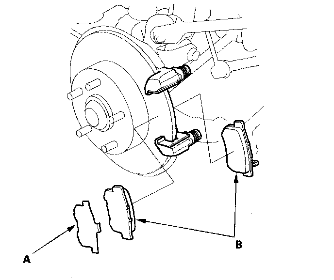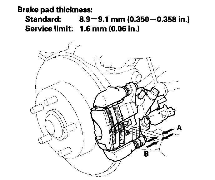 3. Check the thickness of the inner pad (A) and outer pad (B). Do not include the thickness of the backing plate.