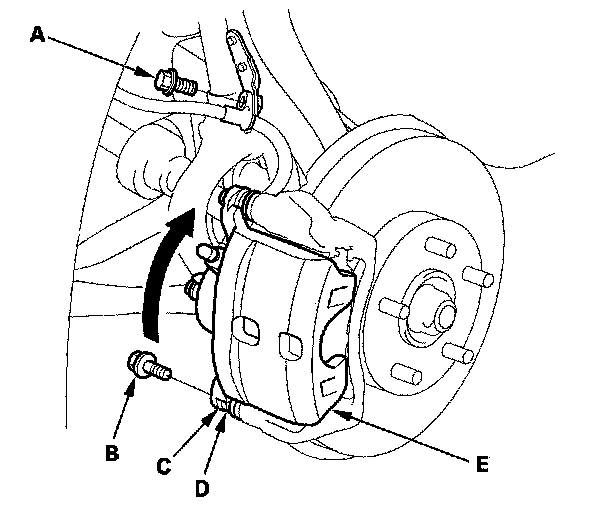 5. Remove the flange bolt (B) while holding the caliper pin (C) with a wrench being careful not to damage the pin boot (D), and pivot the caliper (E) up out of the way. Check the brake hose and pin boots for damage and deterioration.