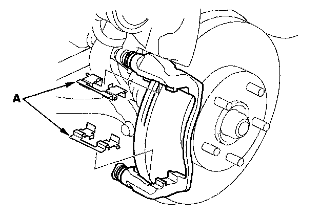 8. Remove the pad retainers (A), and check the caliper pin for free movement.