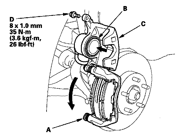15. Pivot the caliper (C) down into position. Install the flange bolt (D), and tighten it to the specified torque while holding the pin A with a wrench being careful not to damage the pin boot.