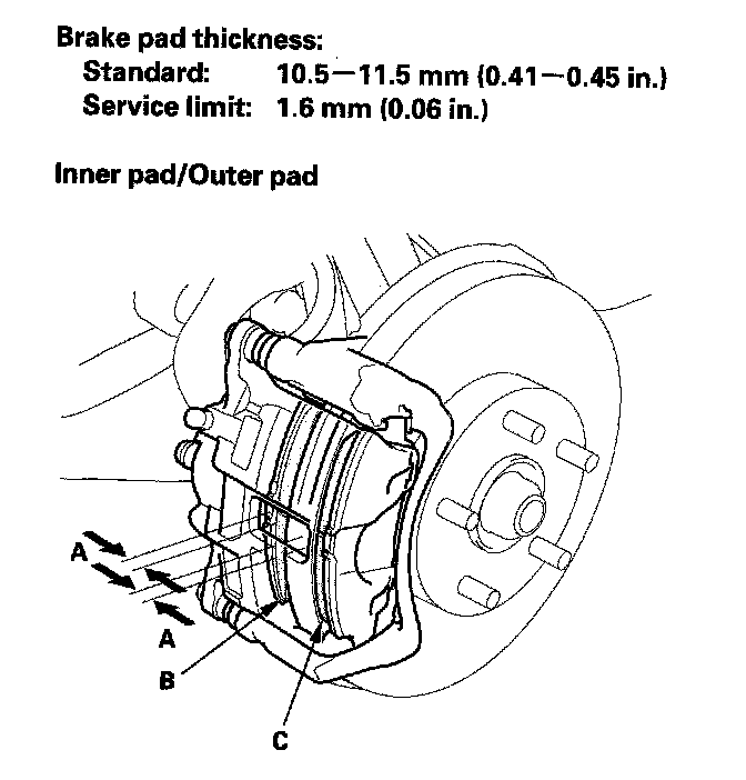 3. Check the thickness (A) of the inner pad (B) and outer pad (C). Do not include the thickness of the backing plate.