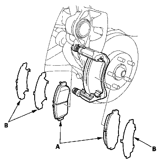 6. Remove the brake pads (A) and the pad shims (B).