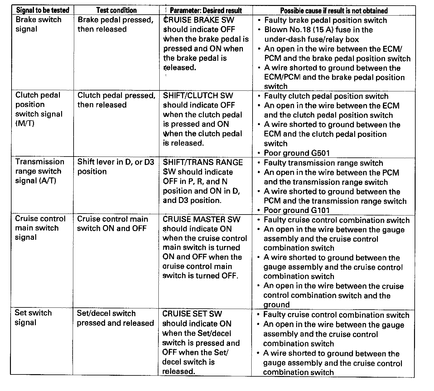 NOTE: Intermittent failures are often caused by loose circuit connections. While monitoring cruise control inputs, flex their circuits, and note if any of the test result change.