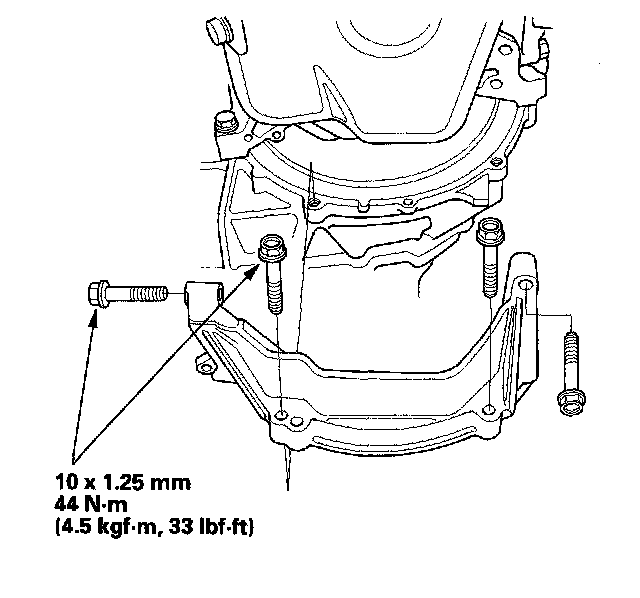 19. Tighten the transmission upper mount bracket plate mounting bolts, then tighten the transmission upper mount bolt (A/T).