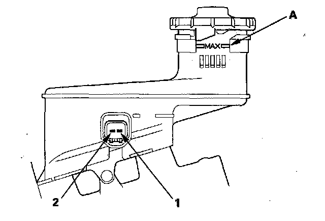 ^ Fill the reservoir with brake fluid to the MAX (upper) level (A). With the float up, there should be no continuity.