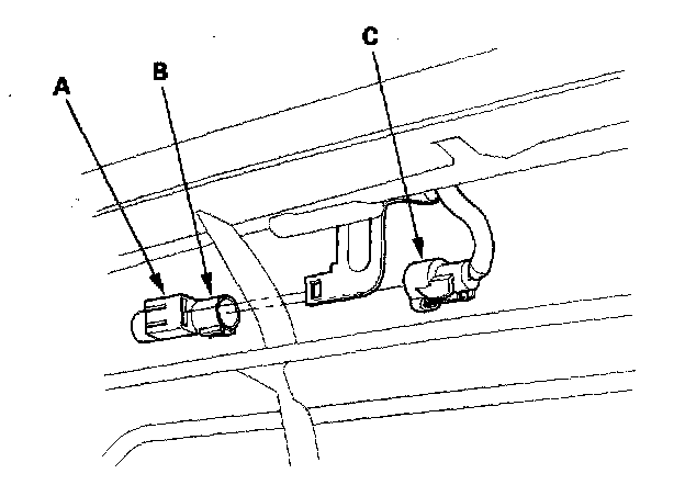 Outside Air Temperature Sensor Replacement1. Lift the tab (A) to release the lock, then remove the outside air temperature sensor (B) from the back of the front bumper beam. Disconnect the 2P connector (C) from the outside air temperature sensor.