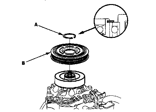 3. If you are replacing the field coil, remove the snap ring (A) with snap ring pliers, then remove the rotor pulley (B). Be careful not to damage the rotor pulley and A/C compressor.