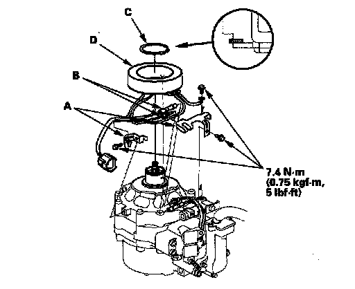 4. Remove the bolts and holders (A), then disconnect the thermal protector connectors (B). Remove the bolt from the field coil ground terminal. Remove the snap ring (C) with snap ring pliers, then remove the field coil (D). Be careful not to damage the field coil and A/C compressor.