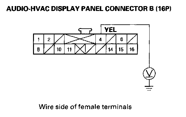 4. Measure the voltage between audio-HVAC display panel connector B (16P) terminal No. 4 and body ground.