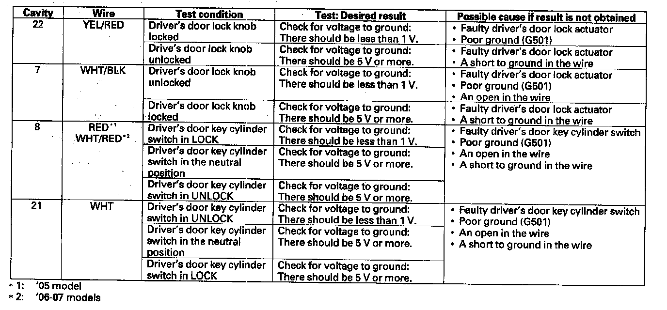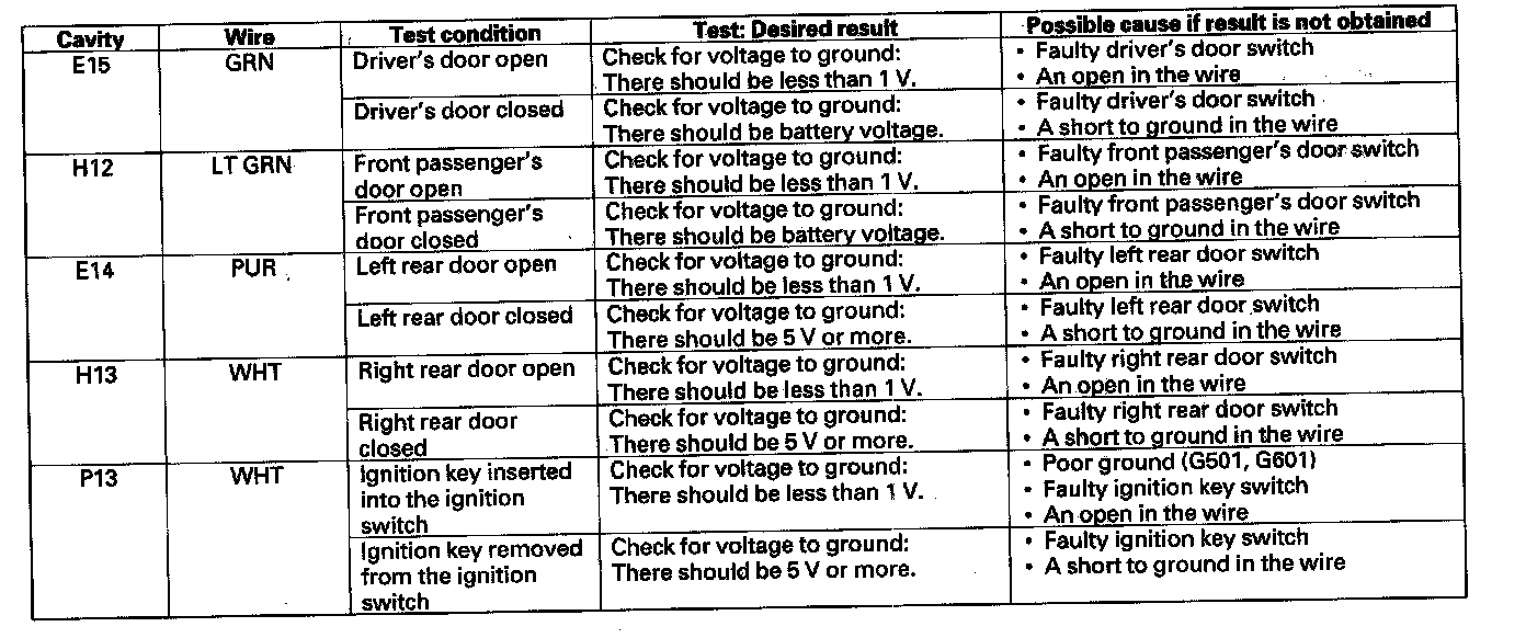11. Reconnect the connector to the door multiplex control unit, and make these input tests at the appropriate connector.