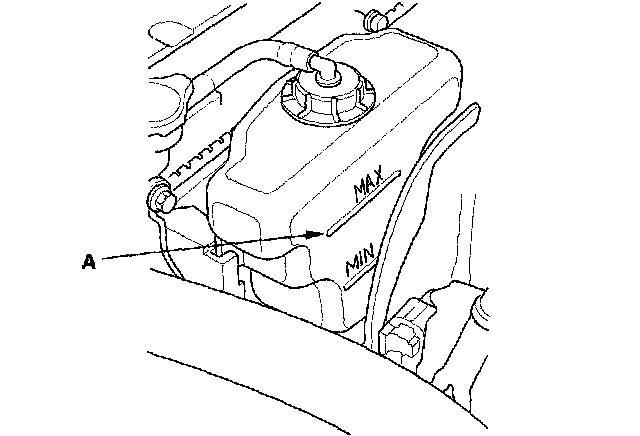 8. Fill the reserve tank to the MAX mark (A) with Honda Long Life Antifreeze/Coolant Type 2 (P/N OL999-9001).
