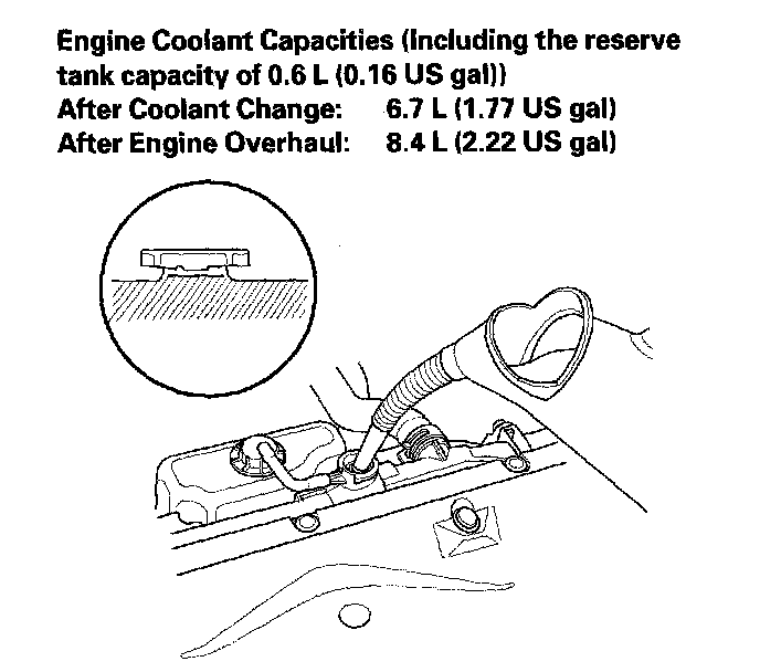 9. Pour Honda Long Life Antifreeze/Coolant Type 2 into the radiator up to the base of the filler neck.