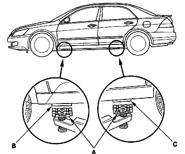1. Position the lift blocks (A) under the vehicle's front support points (B) and rear support points (C).