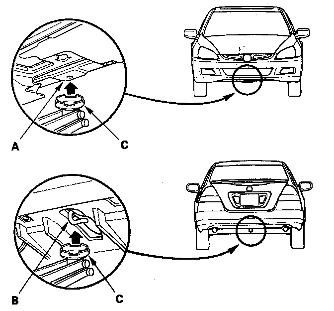 3. Position the floor jack under the front jacking bracket (A) or the rear jacking bracket (B). Center the jacking bracket on the jack lift platform (C), and jack up the vehicle high enough to fit the safety stands under it.